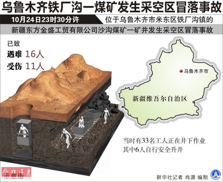 10月24日23时30分许,乌鲁木齐市米东区铁厂沟镇一煤矿发生采空区冒落事故,致16人遇难、11人受伤。目前受伤人员已被送往附近医院救治,事故具体原因及善后工作正在有序开展。